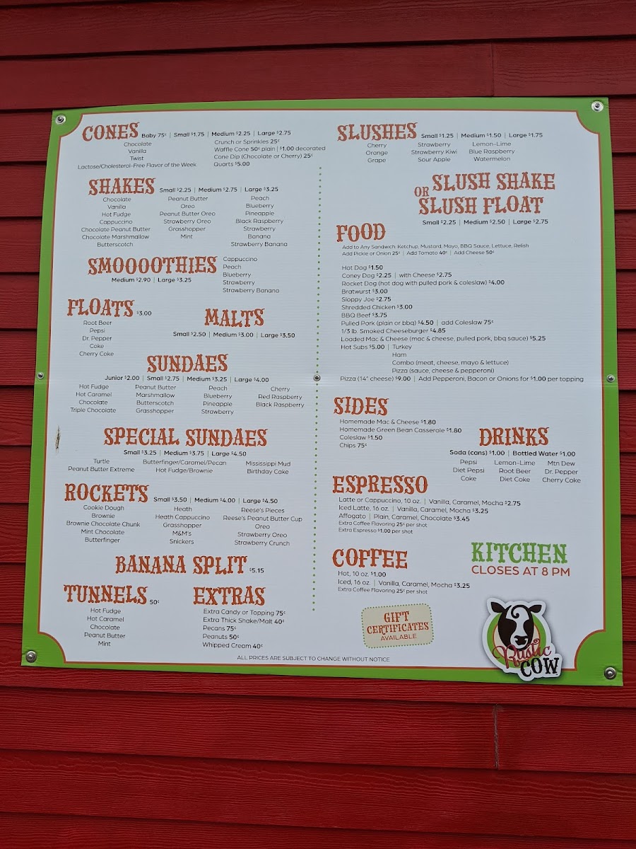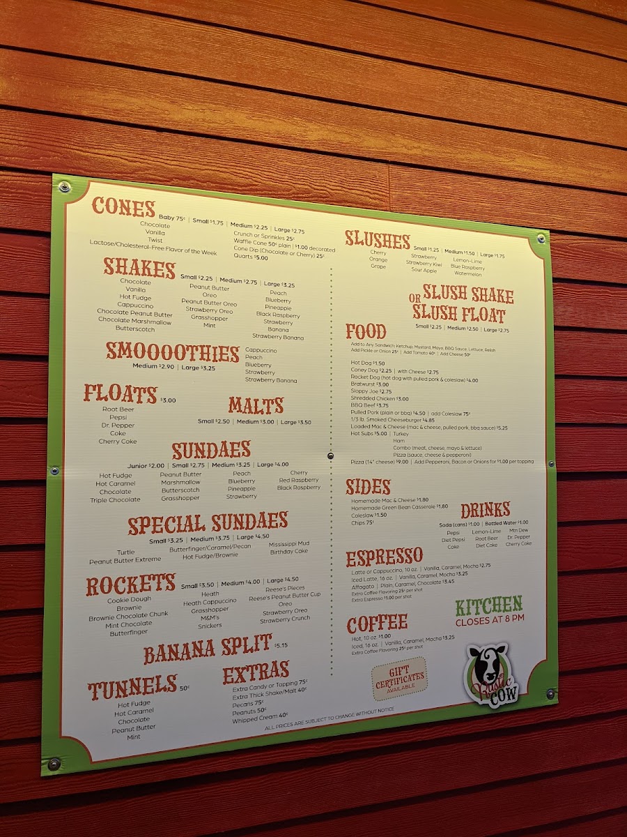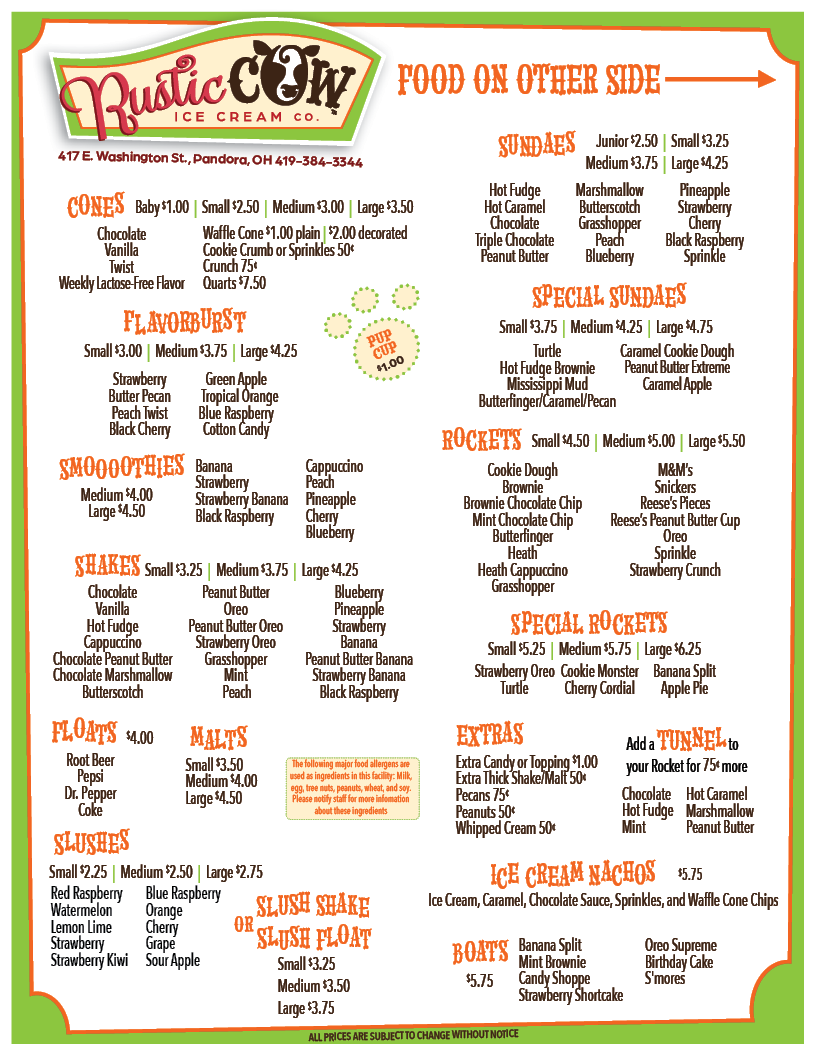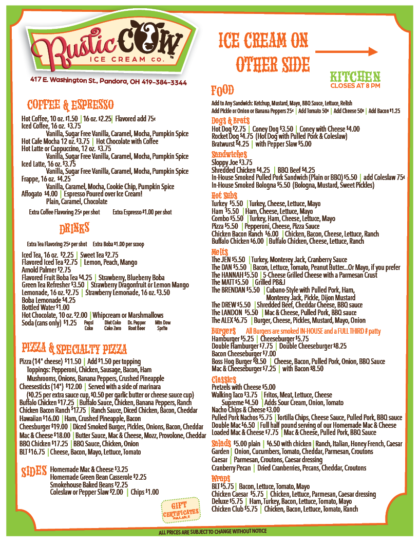 Located in the heart of Pandora, Ohio, the Rustic Cow Ice Cream Co. Menu is a sweet invitation to slow down and savor life’s simple joys. This cozy spot at 417 E Washington St is known for crafting ice cream that tastes like summer memories in a cone. From classic flavors like creamy vanilla bean and rich chocolate fudge to playful options like cookie dough, butter pecan, and seasonal creations, every scoop is made with care and local charm. The menu doesn’t stop there - sundaes piled high with toppings, thick hand-spun milkshakes, and waffle cones baked fresh daily make choosing just one treat nearly impossible. Whether you’re stopping by after dinner, taking a drive through town, or cooling off on a sunny afternoon, Rustic Cow turns dessert into a small-town experience worth savoring.